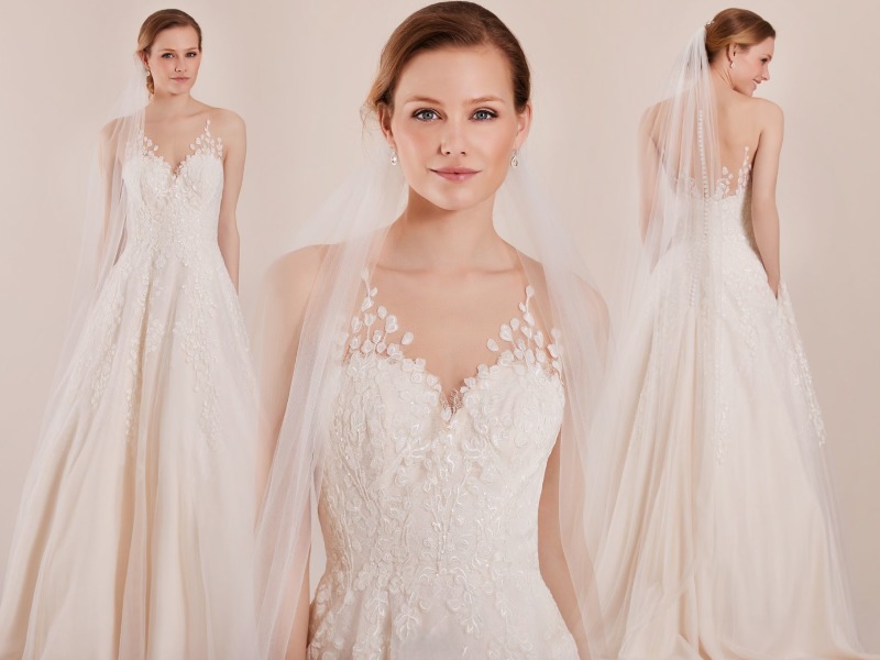 A 38-as méretű menyasszonyi ruha mellbősége 91 cm, derékbősége 72 cm, csipőbősége 102 cm.