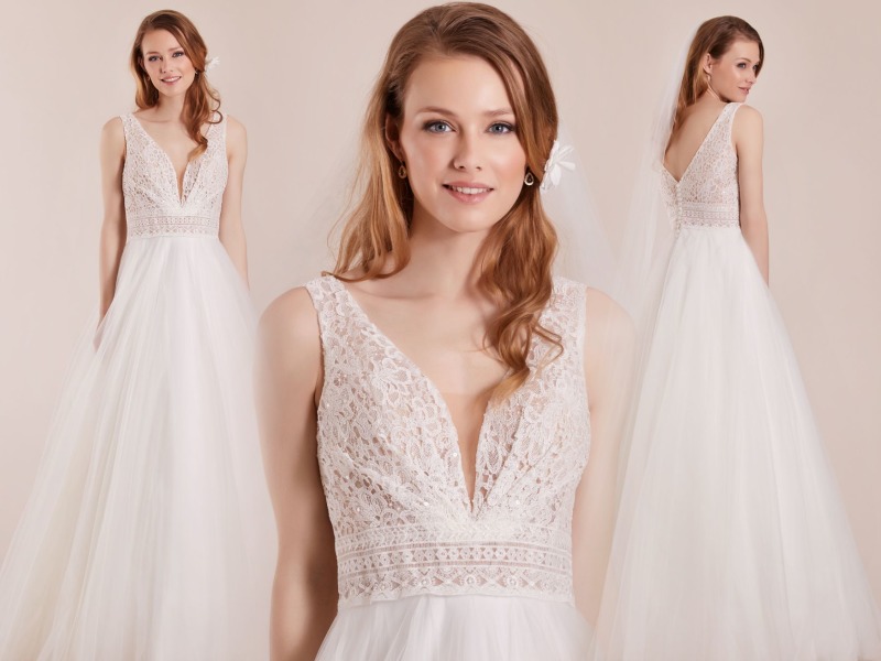 Nőies LILLY menyasszonyi ruha, csipke felsőrész finom flitteres csillámmal és A-vonalú tüll szoknyával.
